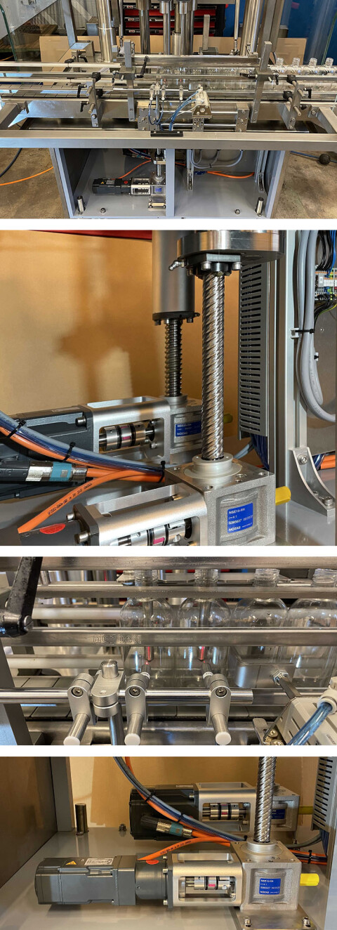 Nozag unterstützte den Projektleiter bei Fricke und berechnete die nötigen Komponenten, die zusammengreifen mussten. Das Spindelhubgetriebe bot sich an, denn es kann problemlos elektronisch gesteuert werden. Damit die gewünschte Feinjustierung noch optimiert werden konnte, wurden auch ganz gezielt Kugelumlaufspindeln im Spindelhubgetriebe verwendet. Nozag hat die Spindelhubgetriebe NSE / KGT im Standardsortiment. Diese erzeugen dank eingesetzten Kugeln weniger Reibung und erlauben eine feine und ruhige Bewegung und trotzdem sehr hohe Geschwindigkeiten. Das war von Vorteil, damit die Einfüllstutzen einerseits sehr schnell hochgefahren werden und sich anderseits sehr langsam mit der Befüllung mitbewegen. Im Übergang zu den Elektromotoren wurden Klemmnabenkupplungen eingesetzt.